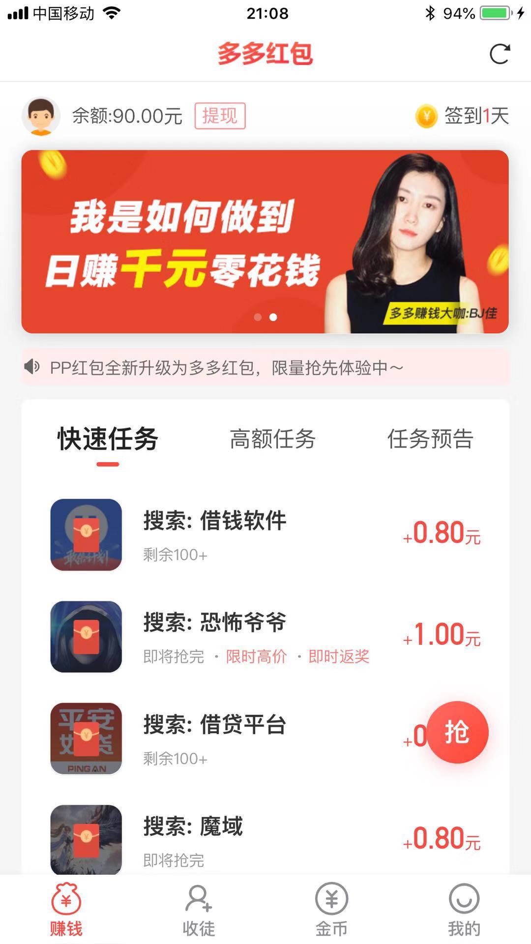 多多红包原PP红包,一个非常靠谱的苹果手机兼职赚钱app,多多红包赚钱,新用户注册就送1元红包,只需三分钟试玩就可以获得丰富的现金奖励,试玩赚钱任务单价高达0.88元,每天任务量都挺多的,是各大网站推荐的手机赚钱软件。