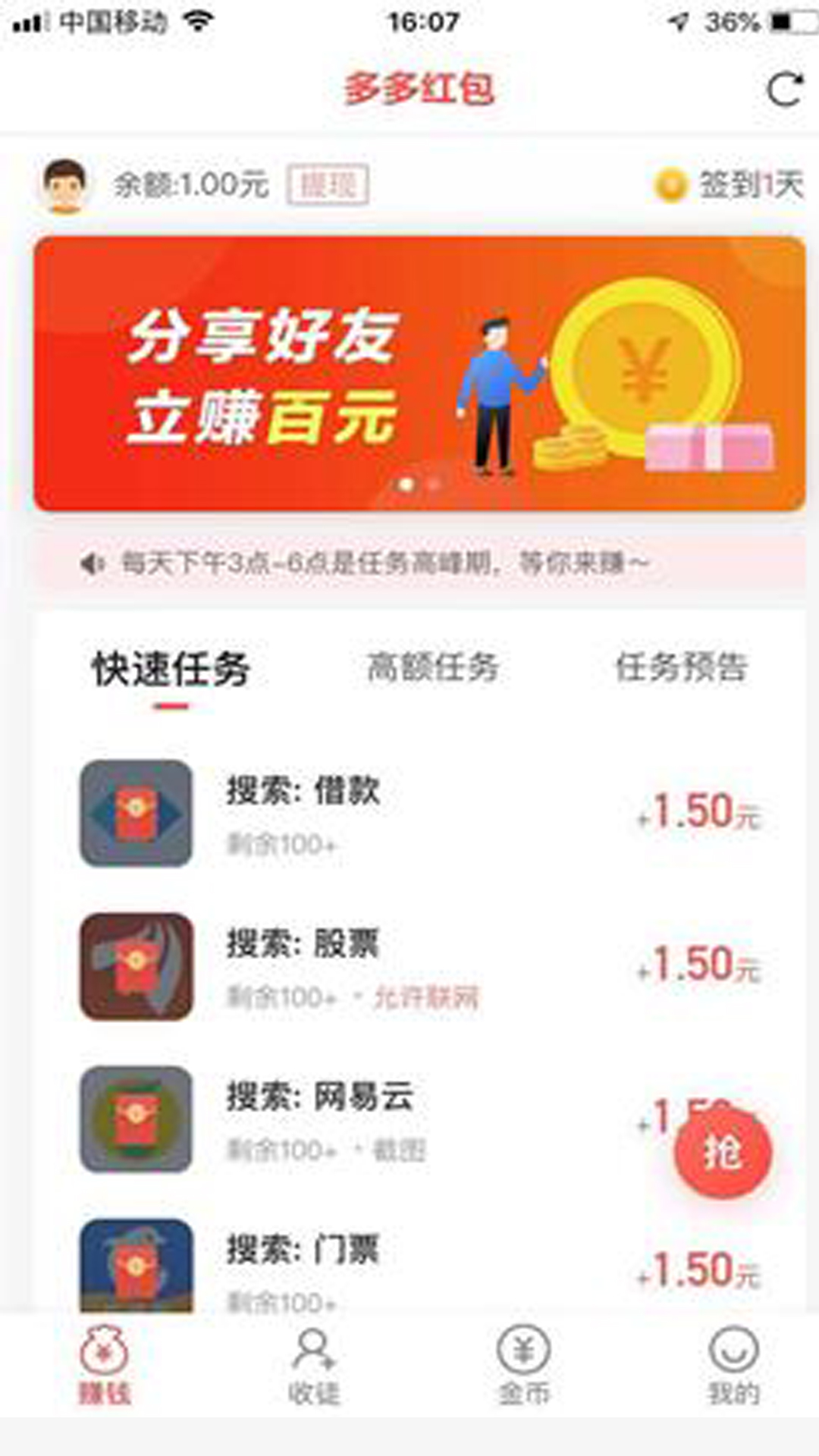 3.平台任务丰富,每天下午3-5点更新大量赚钱任务